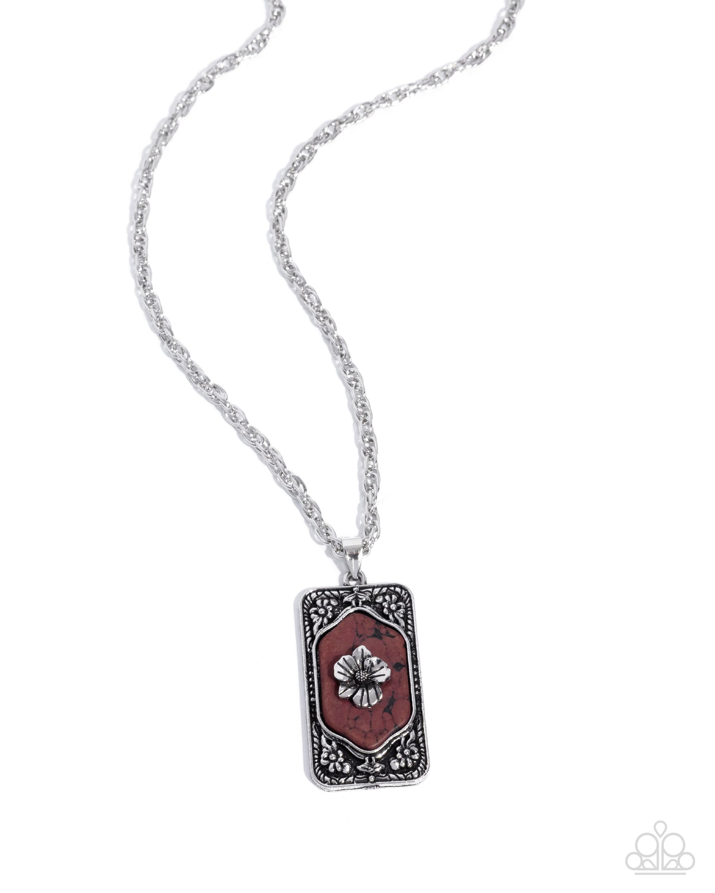 Blooming atop a pinched brown stone backdrop, a glistening silver flower stands out amidst a rounded, rectangular silver frame embellished in floral filigree and texture along an abstract silver chain for a wildly whimsical display. Features an adjustable clasp closure. As the stone elements in this piece are natural, some color variation is normal.