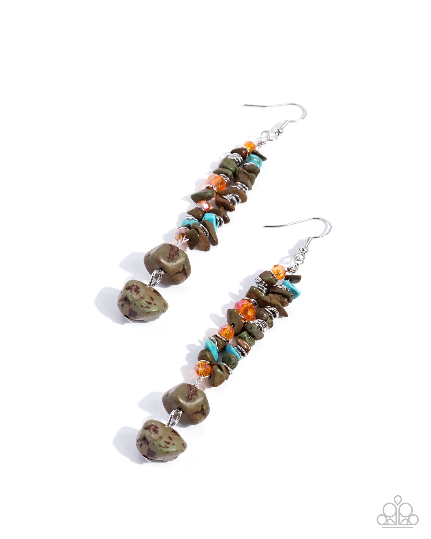 Threaded along dainty silver wires, a chiseled collection of green, turquoise, and brown stones joins faceted orange gems, and copious silver rings elongating below the ear to a solitaire green stone for an unexpected pop of eclectic color. Earring attaches to a standard fishhook fitting. As the stone elements in this piece are natural, some color variation is normal.
