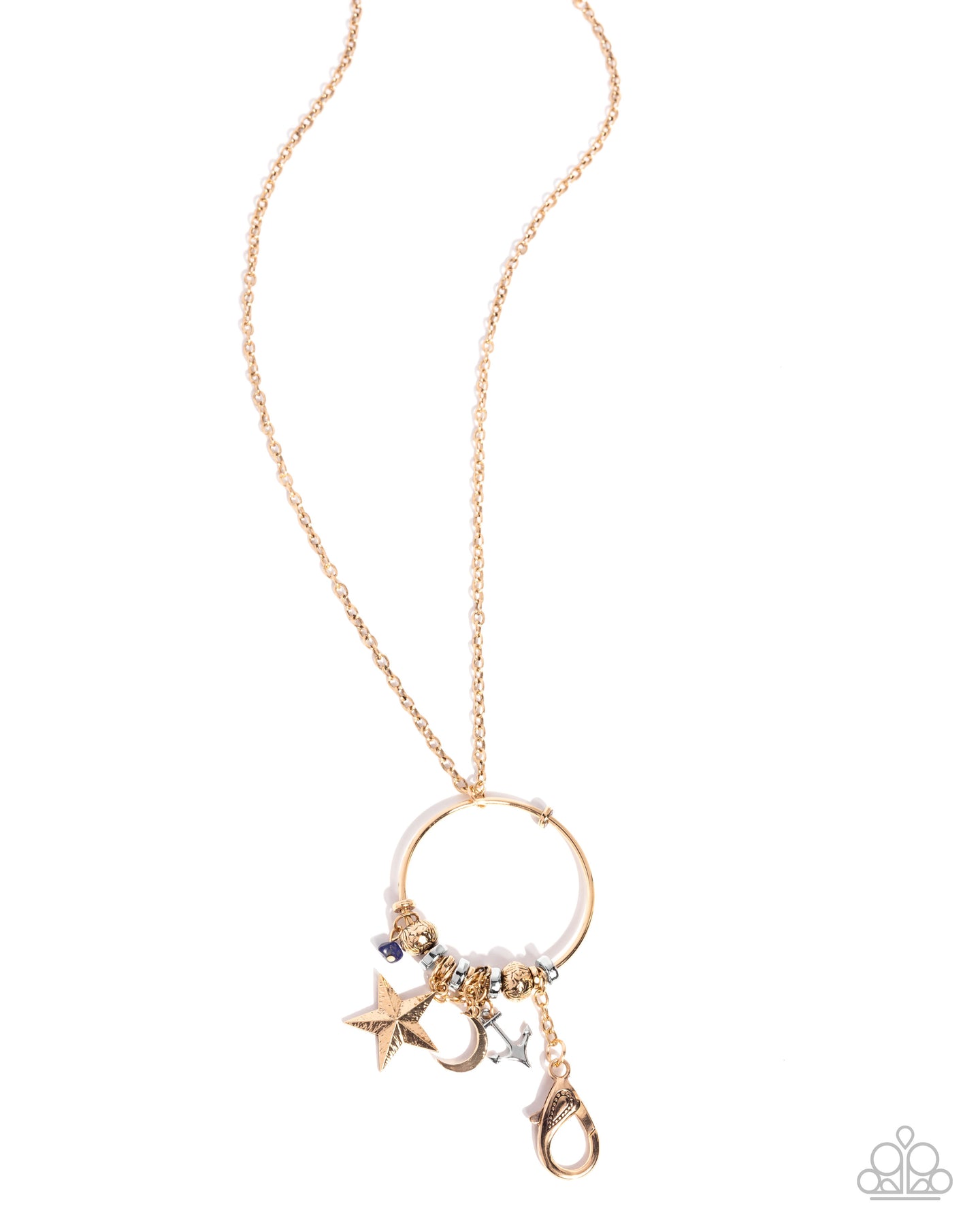 Gliding along an extended gold cable chain, a glistening gold hoop infused with a collection of gold and silver charms including a silver anchor, a gold crescent moon, a hammered gold star, a chiseled lapis stone, silver discs, textured thick gold beads, gold discs in varying sizes, and additional gold chains sways below the chest for a free-spirited fashionable look. A lobster clasp hangs from the bottom of the hoop to allow a name badge or other item to be attached. Features an adjustable clasp closure. As the stone elements in this piece are natural, some color variation is normal.