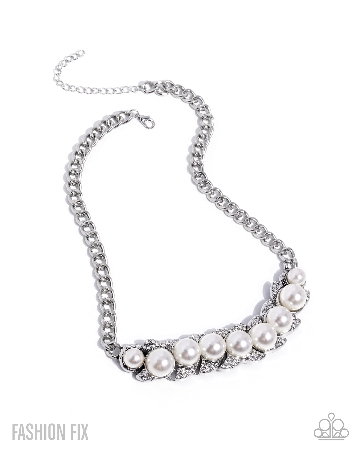 Infused along a classic silver chain, a collection of baroque white oval pearls, silver accents, Montana faceted beads, white rhinestone-dusted silver discs, and UV-shimmery blue beads pattern and coalesce below the neckline for a lively, ladylike display. Features an adjustable clasp closure.