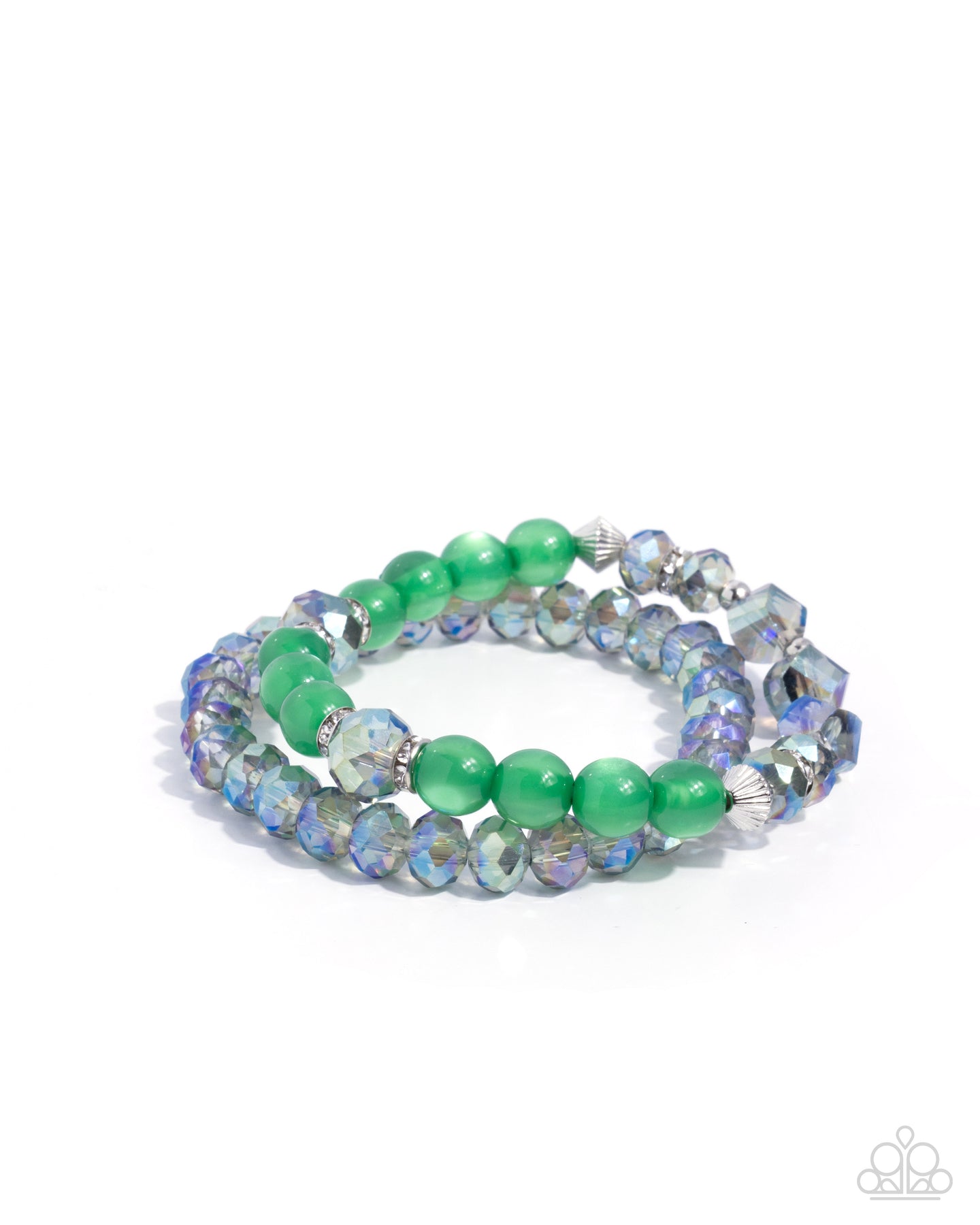 Threaded along a coiled wire, a collection of textured green UV shimmery beads, white iridescent seed beads, beehive-textured red UV shimmery transparent beads, silver studs, red faceted beads, milky green cylindrical beads, and floral silver beads collect and stack along the wrist for a brilliantly bold infinity wrap-style bracelet. Due to its prismatic palette, color may vary. Sold as one individual bracelet. Intended for adult use. . This Pink Diamond Encore is back in the spotlight at the request of our 2025 Life of the Party member with Pink Diamond Access, Mandi W. .