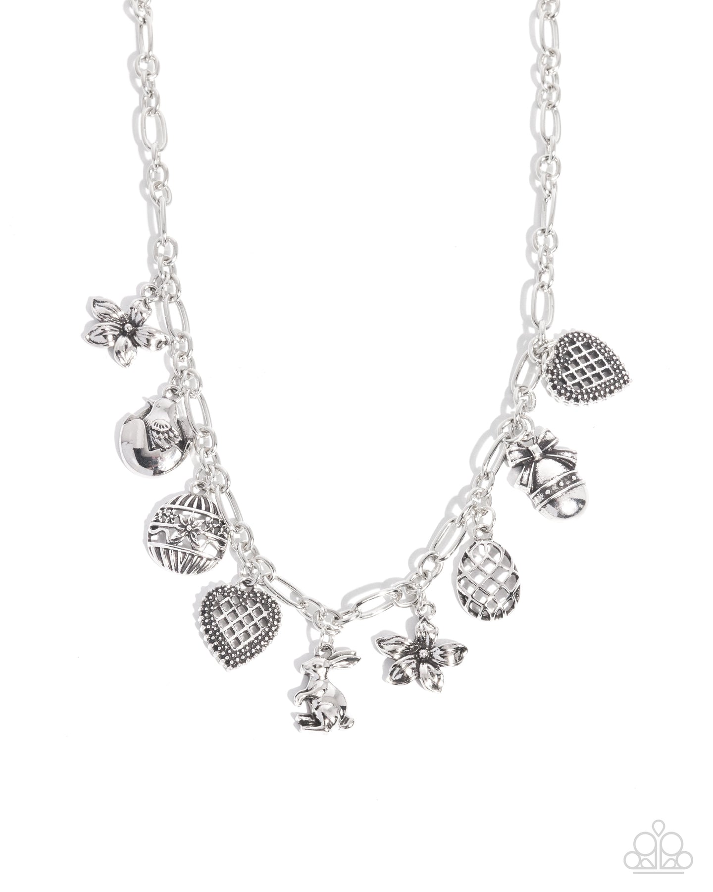 Elongated hammered shiny copper links, connected by dainty shiny copper jump rings, lead down the neckline to a collection of vintage charms, including a baroque white pearl, a shiny copper fleur-de-lis, a shiny copper hummingbird, a shiny copper-studded flower, and a white pearl emerging from textured shiny copper petals. Features an adjustable clasp closure.