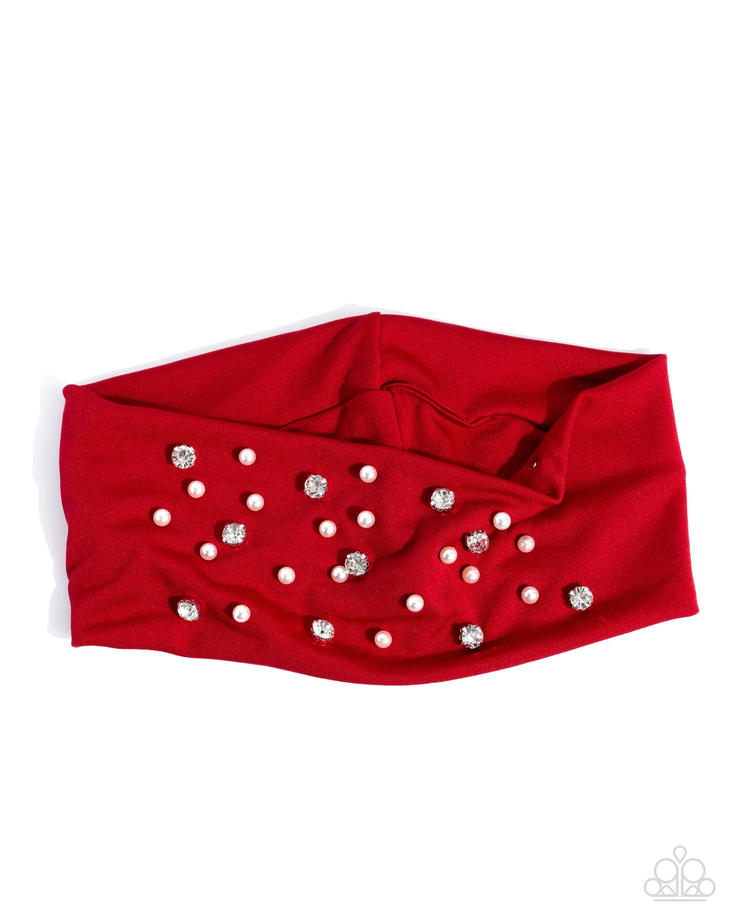 Featuring copious glossy white pearls and silver-pronged white rhinestones, a red soft fabric headband curls atop the head, evoking a pretty, polished look.
