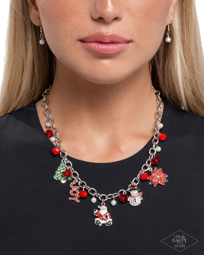 Cascading in a whimsical manner along a glistening silver cable chain, a collection of Christmas-inspired details including white pearls, faceted red beads, transparent deeper red faceted beads, a red and green-painted poinsettia flower with a pearl center, a black, red, and white rhinestone-embellished silver snowman complete with a red and black-painted top hat, a multicolored and pearl-dotted Santa, a green-painted pearl and rhinestone-dotted tree, and the silver word "JOY" with red rhinestone detailing collect below the neckline for a festive flourish. Features an adjustable clasp closure. Sold as one individual necklace. Includes one pair of matching earrings. Intended for adult use.