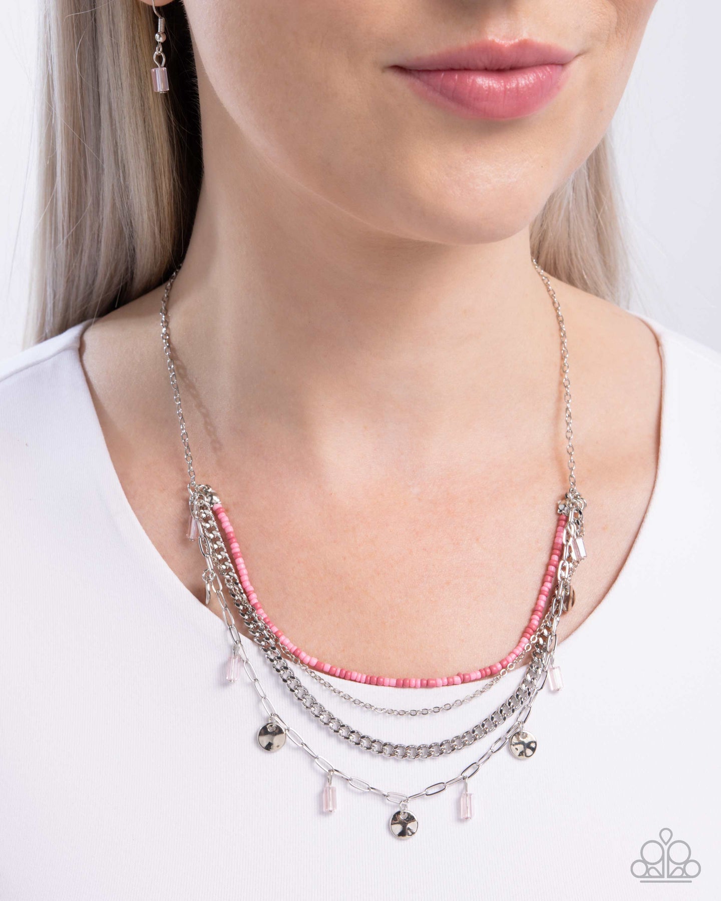 Featuring baby pink and Desert Rose seed beads, a dainty silver chain, a silver curb chain, and hammered silver discs that alternate with cylindrical light peach beads along a classic paperclip, mismatched silver chains layer below the collar from a solitaire dainty silver cable chain, creating a summery fringe below the collar. Features an adjustable clasp closure.