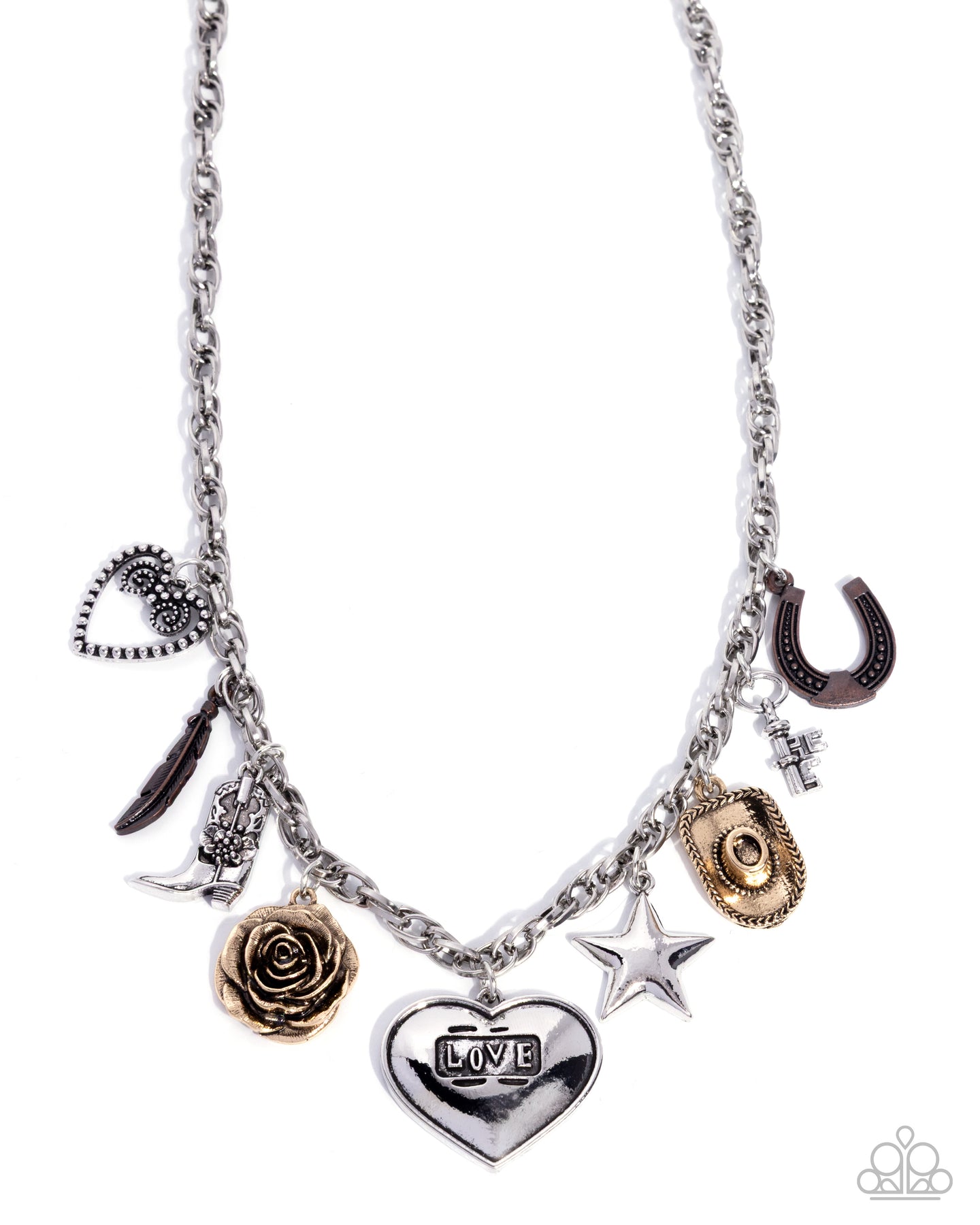 Good Luck To You - White Rhinestone Butterfly Clover Horseshoe Silver Charm Short Necklace - Paparazzi