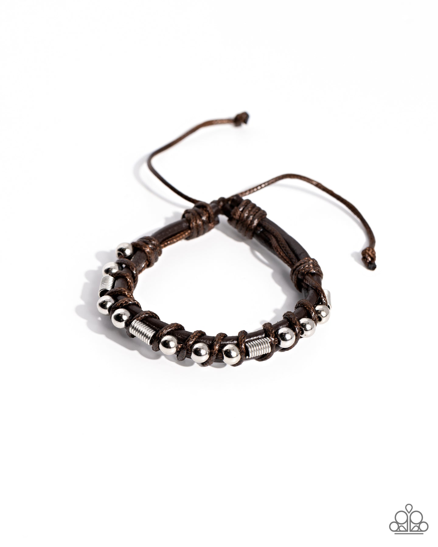 Wrapped into place with glossy brown thread, shiny silver beads and cylindrical coils are threaded along a double layer of thick brown leather cording creating a rustic fashion around the wrist. Features an adjustable sliding knot closure.