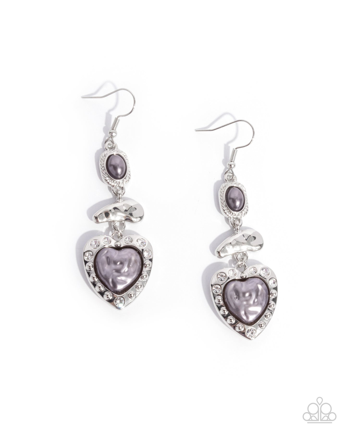 Pressed in a textured silver frame, an oval Gull Gray pearl gives way to a hammered abstract silver bar, which then gives way to an oversized silver heart, adorned with a lustrous baroque Gull Gray pearl center and bordered by dazzling white rhinestones and silver studs, creating a whimsical romantic lure. Earring attaches to a standard fishhook fitting.