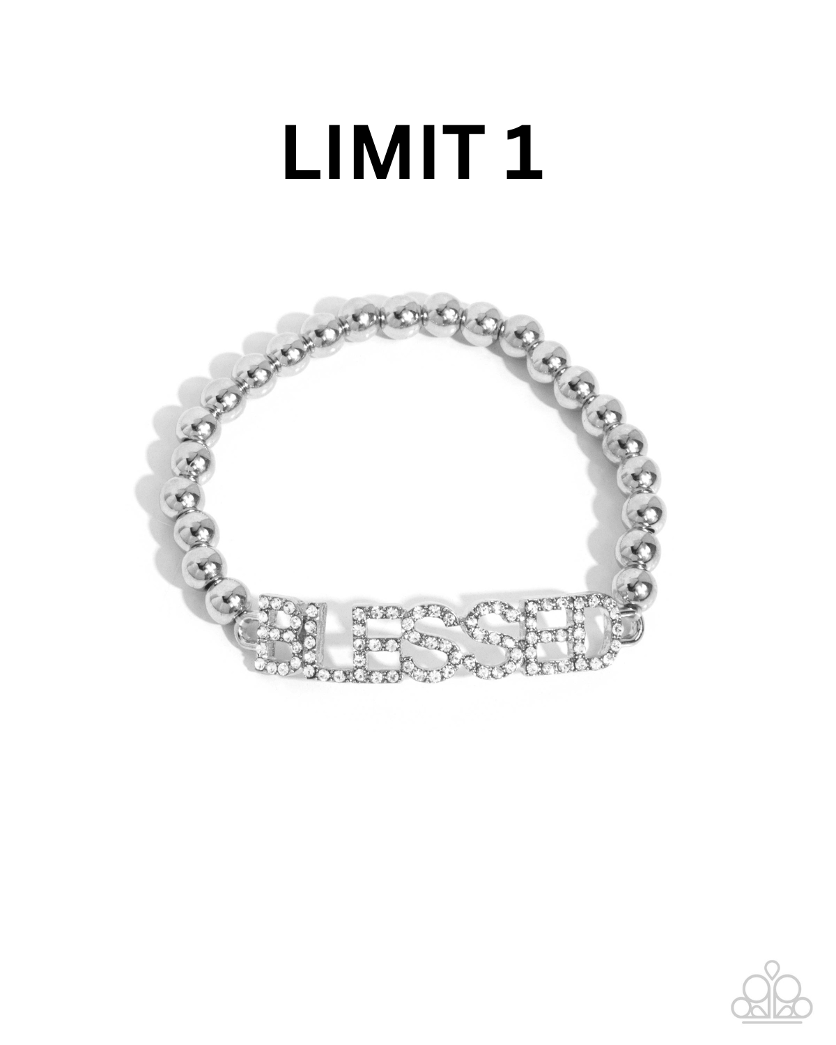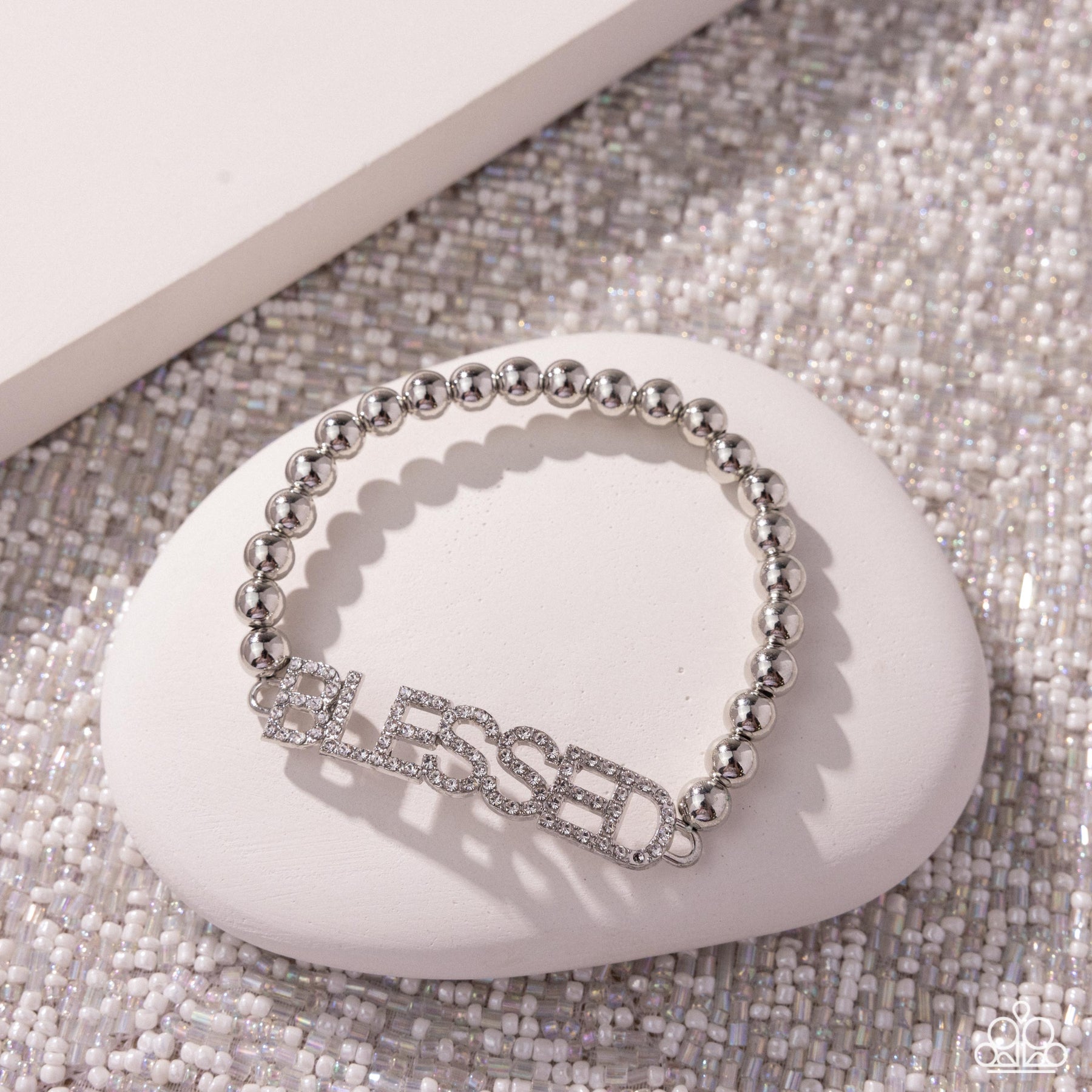LIMIT 1 - Blessed Bounty - White Rhinestone Affirmation Silver Stretchy Bracelet - Paparazzi